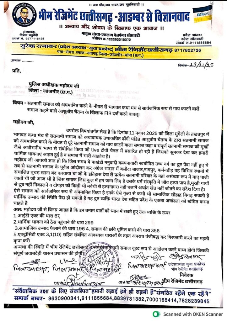 और वो जो चाहे बयानबाजी कर सकते हैं. लेकिन महाराज ये भूल गए कि किसी की जाति, धर्म, ,समाज पर टिप्पणी करना गैरकानूनी है. इस बायनबाज कथावाचक के खिलाफ कड़ी कार्रवाई करने के लिए भीम रेजिमेंट छग. द्वारा जांजगीर चांपा एसपी को ज्ञापन सौंपा गया और आशुतोष चैतन्य के खिलाफ जल्द कानूनी कार्रवाई कर गिरफ्तारी करने की मांग की गयी.